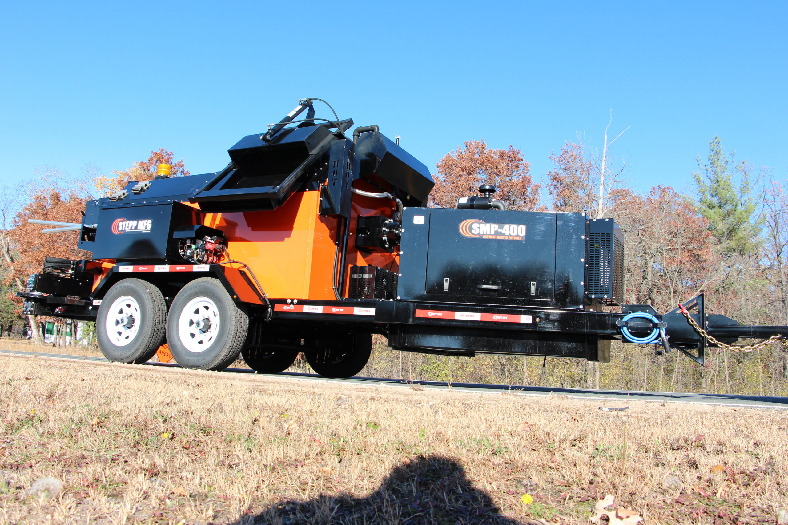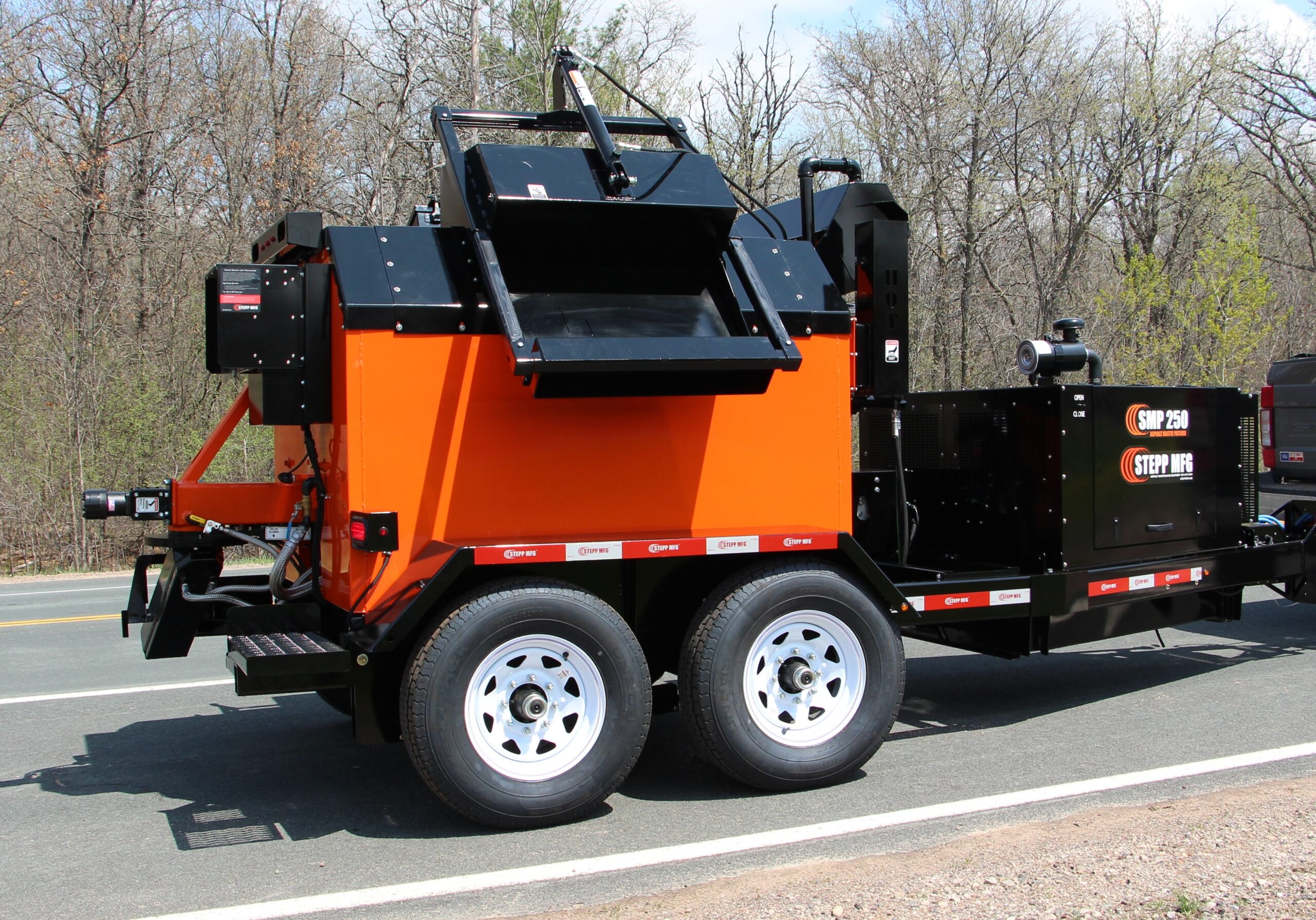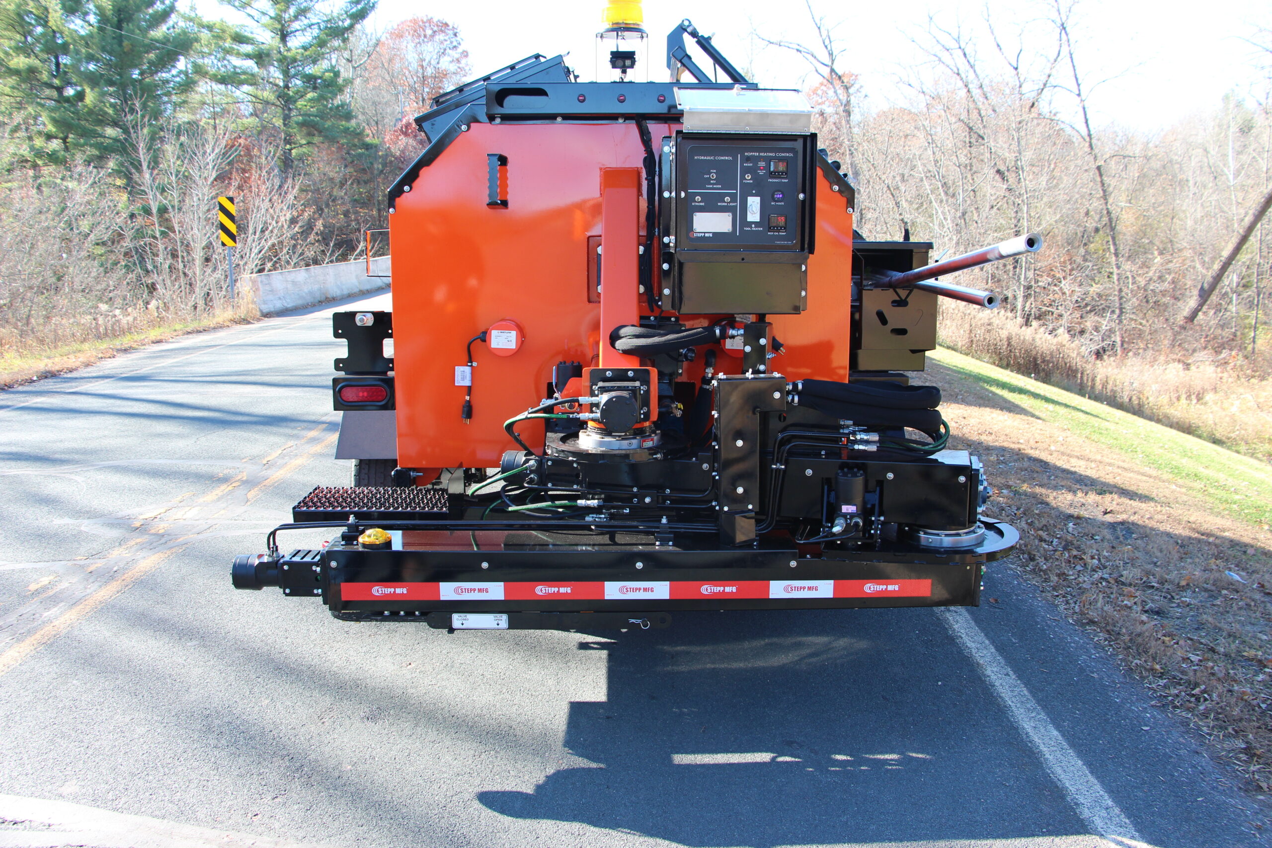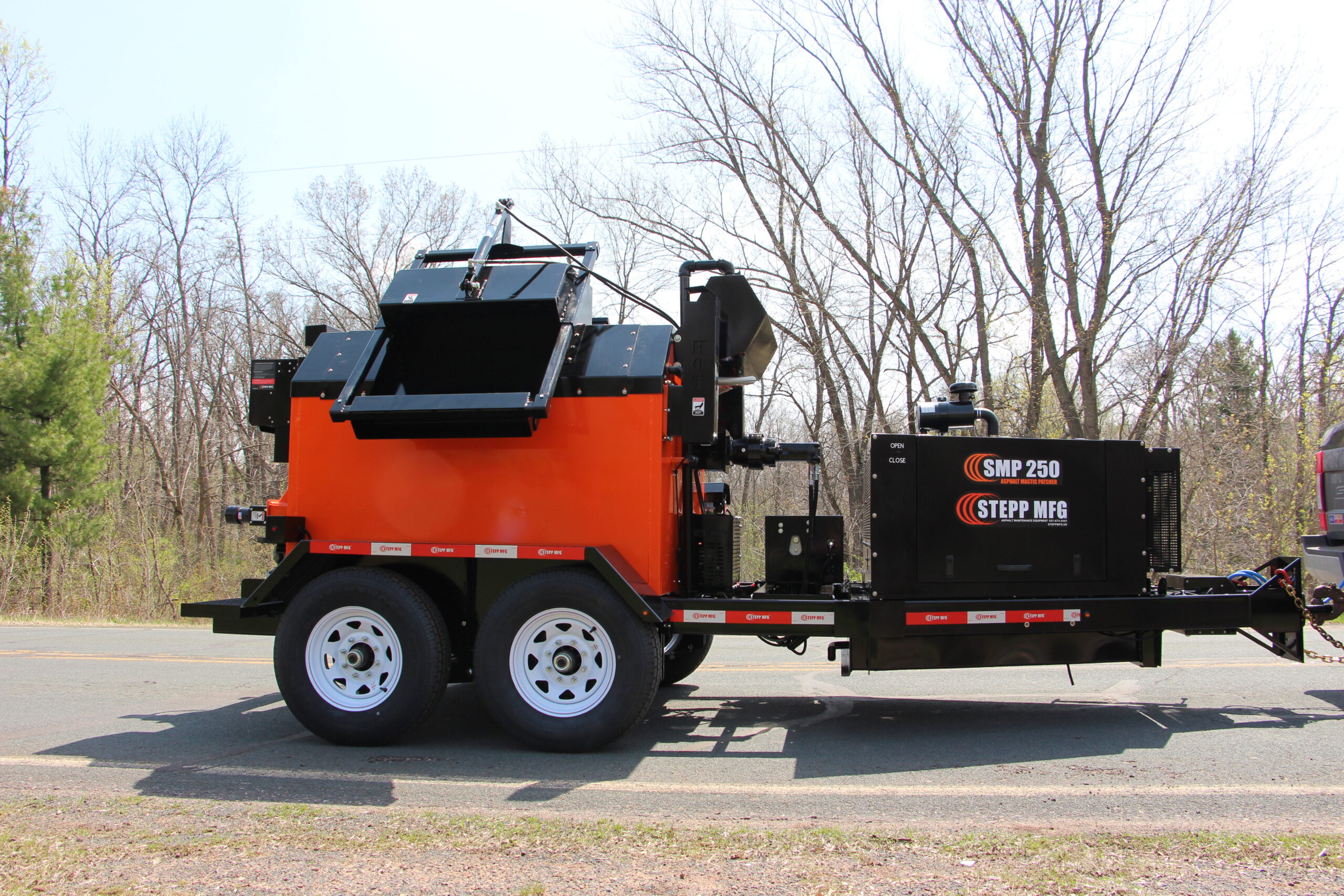Stepp’s SMP Mastic Patchers are designed to heat and apply mastic patch materials for crack filling, bridge deck transitions and deteriorated asphalt and concrete roadways. They are to be equipped with diesel heating systems with automatic temperature controls, and hydraulically powered heated placing augers. Higher temp oil jackets coupled with the double knuckle auger placing system outworks and outperforms the competition.